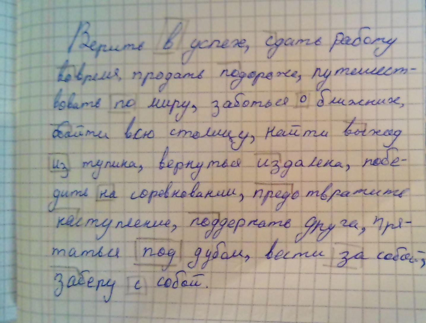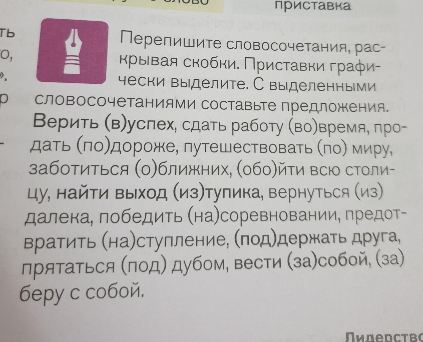 О Перепишите словосочетания, рас- крывая скобки. Приставки графи- чески выделите. С выделенными словосочетаниями составьте предложения. Верить (в)успех, сдать работу (во)время, про- дать (по)дороже, путешествовать (по) миру, заботиться (о)ближних, (обо)йти всю столи- цу, найти выход (из)тупика, вернуться (из) далека, победить (на)соревновании, предот- вратить (на)ступление, (под)держать друга, прятаться (под) дубом, вести (за)собой, (за) беру с собой.