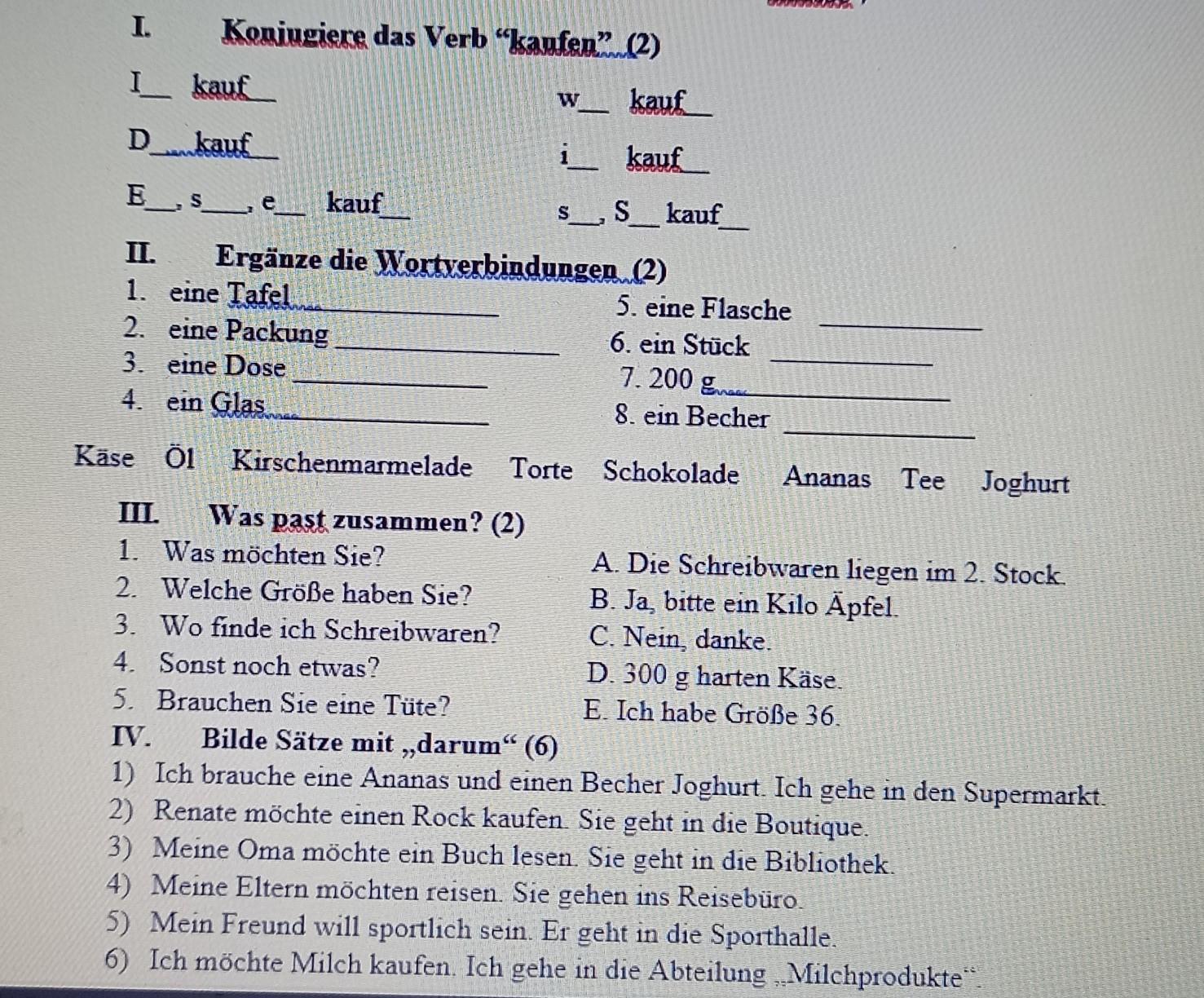 4) darum gehe ich in den Supermarkt; darum geht sie in die Boutique; darum geht sie in die Bibliothek; darum gehen Sie uns Reisebüro; darum geht er in die Sporthalle; darum gehe ich in die Abteilung