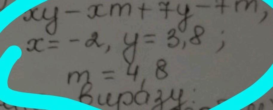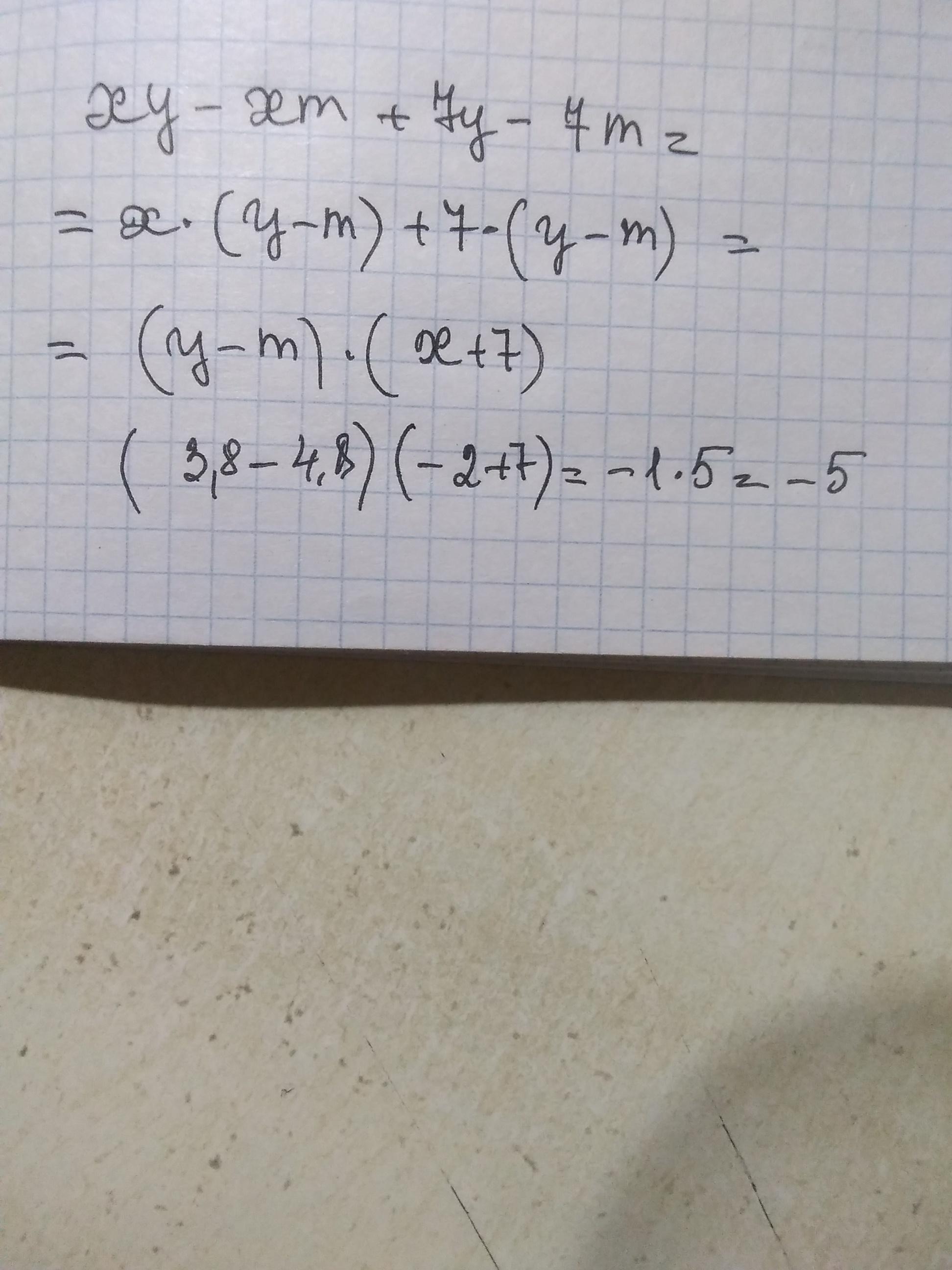 помогите пожалуста: знайдіть значення виразу зручним способом Запишіть вираз у вигляді добутку Та знайдіть його значення xy-xm+7y-7m, x=-2, y=3,8; m = 4,8