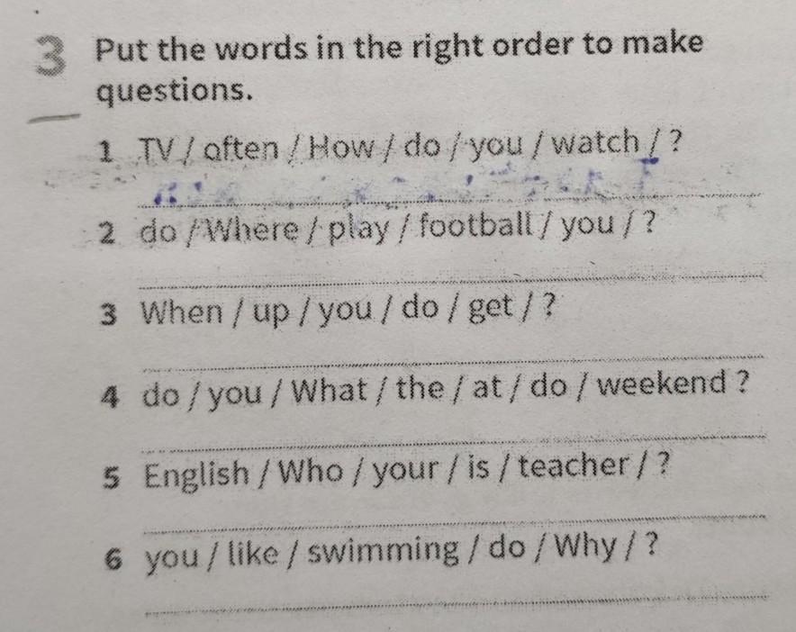 Put the words in the right order to make questions. 1 TV/ aften/How/do/you/watch/? 2 do/Where/ play / football/you/? 3 When/up/you/do/get/? 4 do/you/What/the/at/do / weekend? 5 English/Who / your /is/teacher/? 6 you/like / swimming/do/Why/? Notended