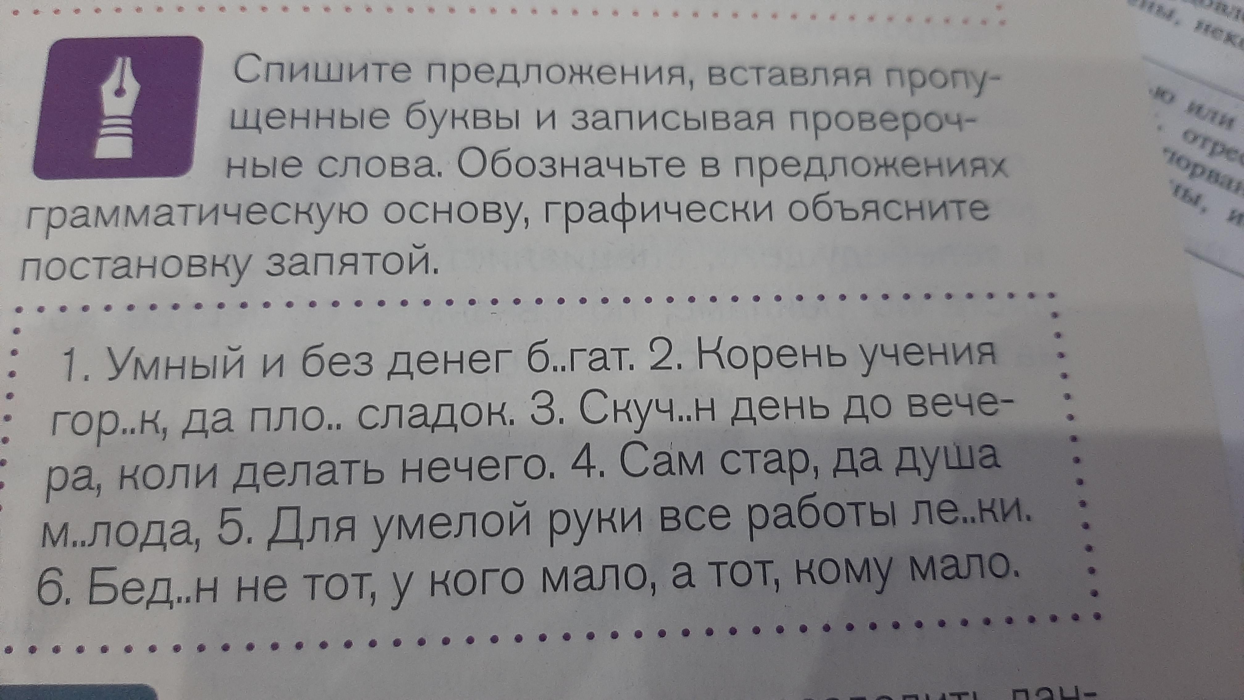 1. Умный и без денег б..гат. 2. Корень учения гор..к, да пло... сладок. 3. Скуч..н день до вече- ра, коли делать нечего. 4. Сам стар, да душа м..лода, 5. Для умелой руки все работы ле..ки. 6. Бед..н не тот, у кого мало, а тот, кому мало.