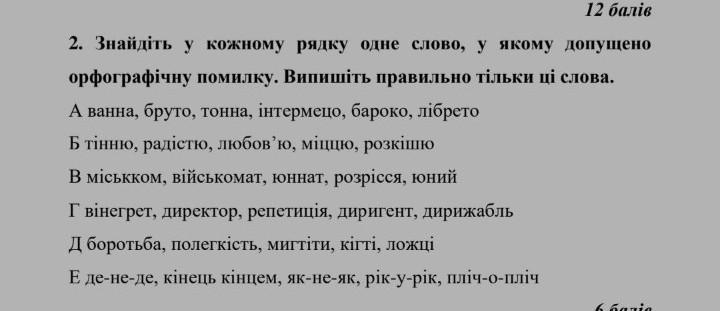 12 балiв 2. Знайдіть у кожному рядку одне слово, у якому допущено орфографічну помилку. Випишіть правильно тільки ці слова. А ванна, бруто, тонна, iнтермецо, бароко, лібрето Б тінню, радістю, любов'ю, мiццю, розкішю В міськком, військомат, юннат, розрiсся, юний Г вінегрет, директор, репетиція, диригент, дирижабль Д боротьба, полегкість, мигтіти, кiтi, ложцi Е де-не-де, кінець кінцем, як-не-як, рiк-у-рiк, пліч-о-пліч 6 haria