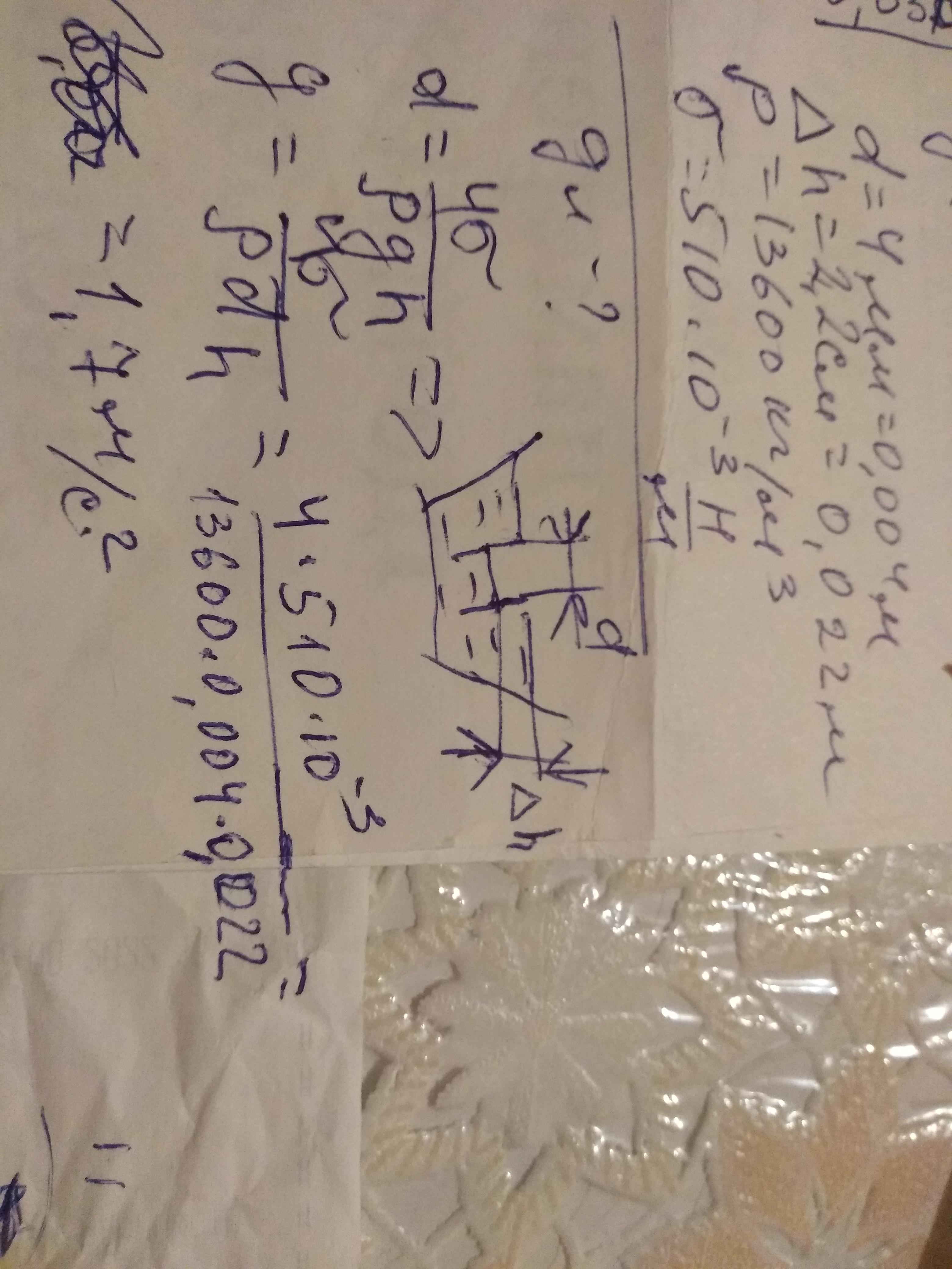 Скляна капілярна трубка занурена в широку посудину з ртуттю на Луні. Знайти прискорення вільного падіння на Луні. Якщо рівень ртуті в капілярній трубці діаметром 4мм нище рівня ртуті в широкій посудині на 2,2 см.