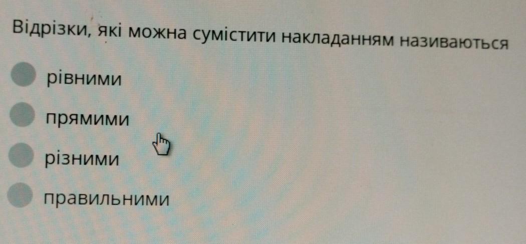 Вiдрiзки, які можна сумістити накладанням називаються а)рівними б)прямими в)різними г)правильними