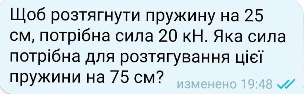 Щоб розтягнути пружину на 25 см, потрібна сила 20 кН. Яка сила потрібна для розтягування цієї пружини на 75 см?