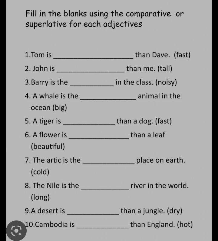 Para completar las oraciones se escriben los adjetivos comparativos o superlativos según corresponda (comparative or superlative adjectives) de la siguiente manera: