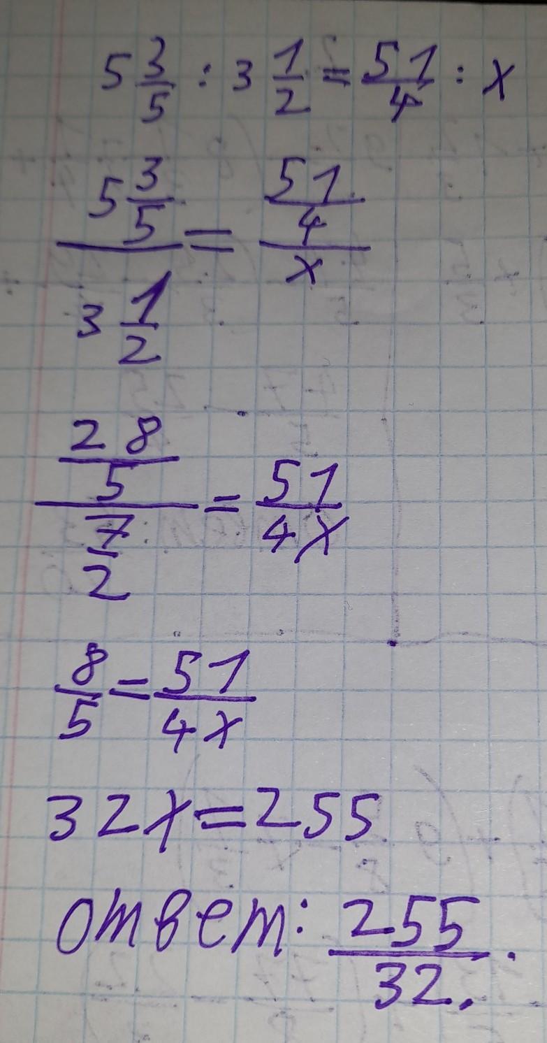Ответ:5 3/5:3 1/2=51/4:x=1 3/5=51/4:x