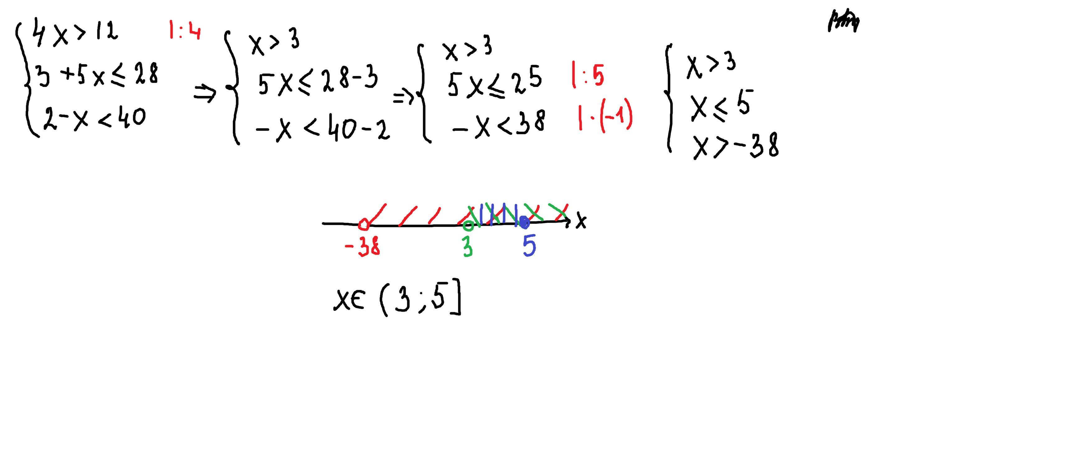 Реши систему неравенств: \begin{cases} 4x>12,\\ 3+5x\le 28,\\ 2-x<40. \end{cases}