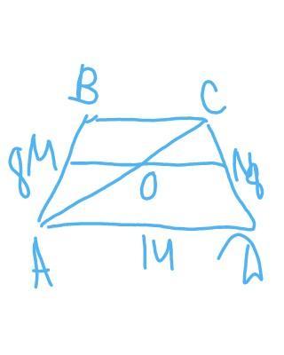 трапеції дорівнює 14 см, а бічна сторона – 8 см. Визначте довжини відрізків, на