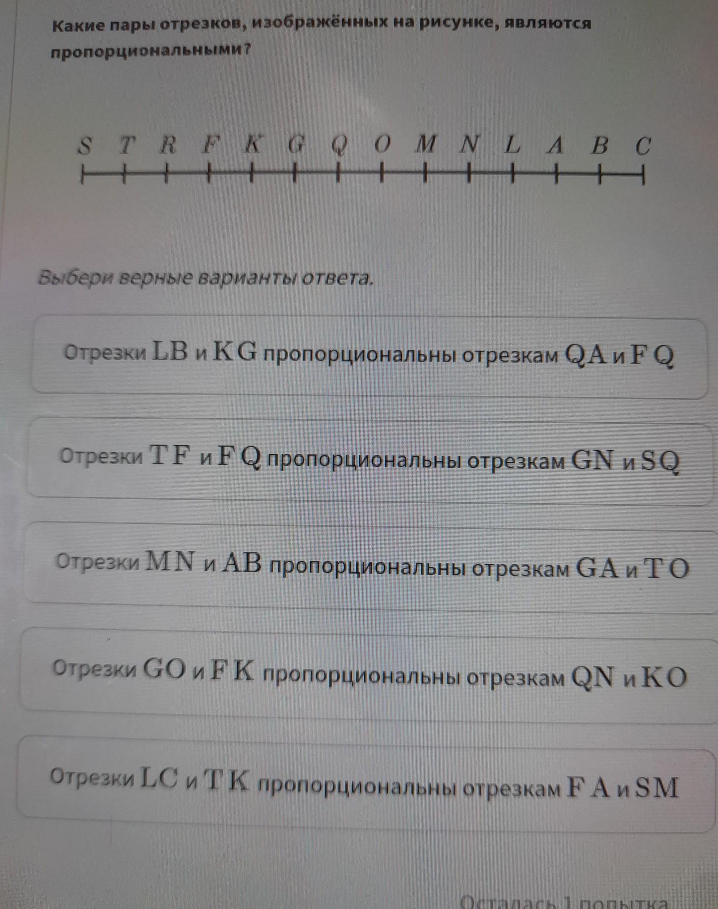 Какие пары отрезков, изображённых на рисунке, являются пропорциональными? Выбери верные варианты ответа.