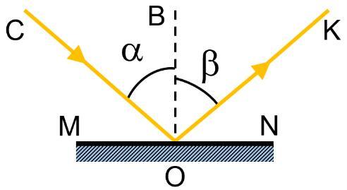 Промінь падаючий і промінь відбитий лежать в одній площині з перпендикуляром, проведеним до межі розділу двох середовищ, і кут падіння променів дорівнює куту відбивання променів.