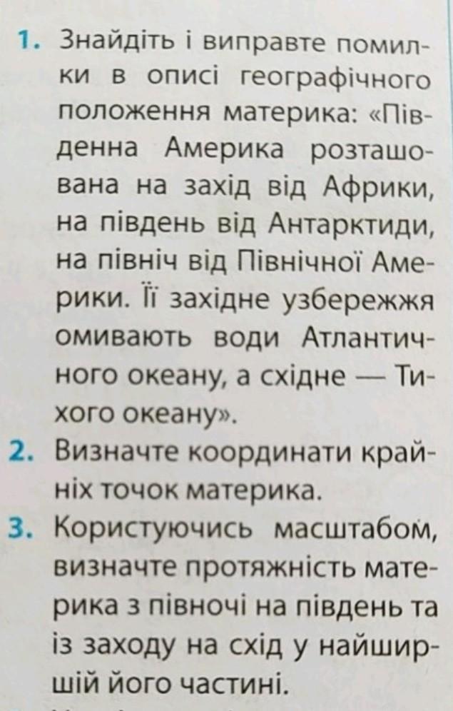 1. Південна Америка розташована на захід від Африки, на північ від Антарктиди и на південь від Північної Америки. Її західне узбережжя омивають води Тихого океану, а східне й північне — Атлантичного.