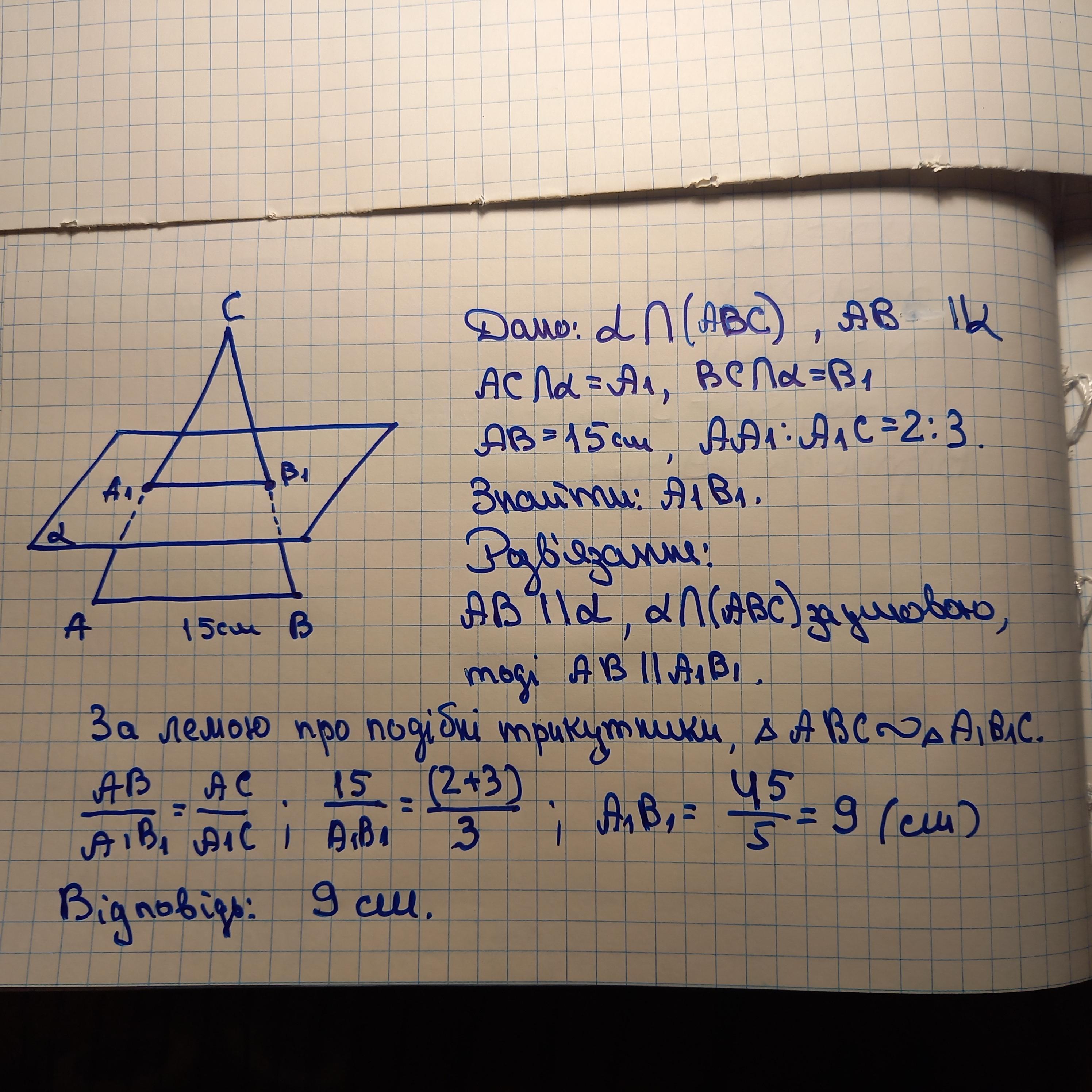 8. Площина, що паралельна прямій АВ трикутника ABC, перетинає сторону АС в точці А1 і сторону ВС в точці В1. Знайти відрізок А1В1, якщо АВ=15см, AA1 :А1С =2:3.