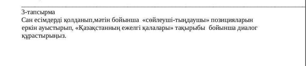 3-тапсырма Сан есімдерді қолданып,мәтін бойынша «сөйлеуші-тыңдаушы» позицияларын еркiн ауыстырып, «Қазақстанның ежелгі қалалары>> тақырыбы бойынша диалог құрастырыңыз.
