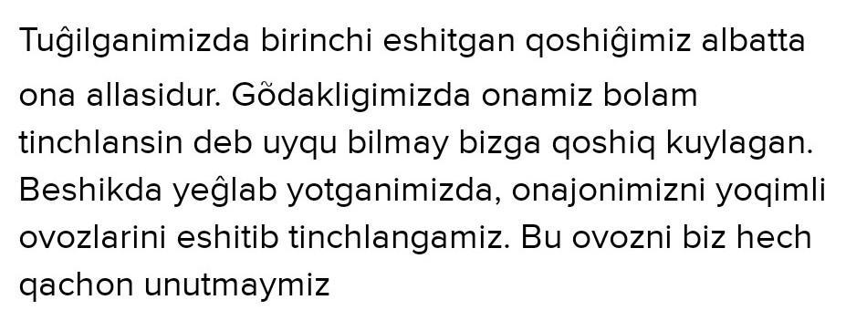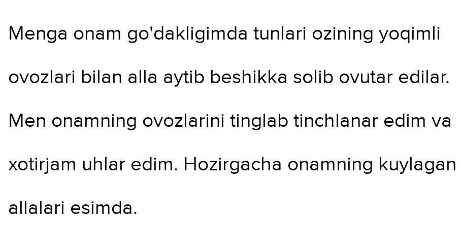 "Biz eshitgan ilk musiqa - ona allasi" mavzusida matn yarating. Foydalanish uchun soʻzlar goʻdaklikda ,tunlari , yoqimli , beshik, ovoz , ona, uyqu, tinglamoq, tinchilanmoq, kuylamoq, xotirjam.