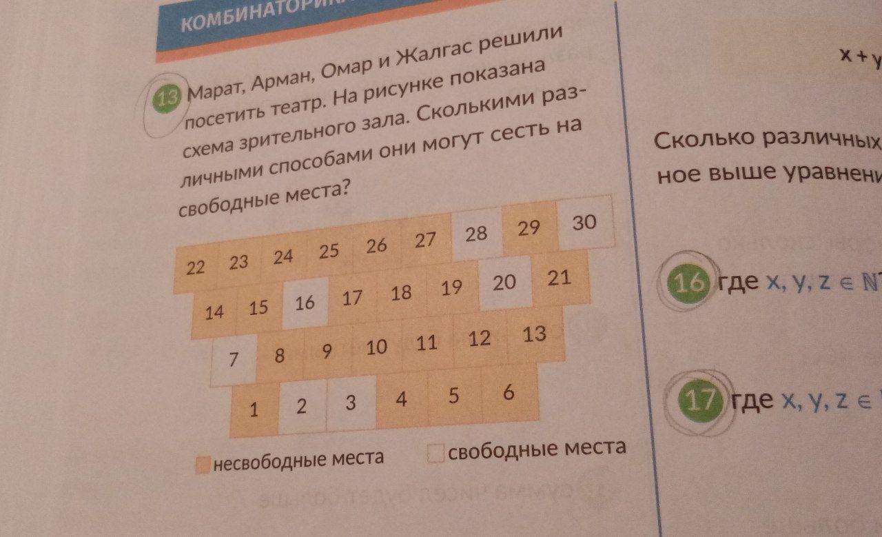 Марат, арман, омар и жалгас решили посетить театр. на рисунке показана схема зрительного зала. сколькими раз- личными способами они могут сесть на свободные места?
