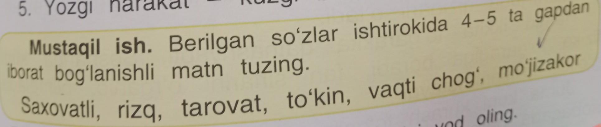 Mustaqil ish. Berilgan so'zlar ishtirokida 4-5 ta gapdan iborat bog'lanishli matn tuzing. Saxovatli, rizq, tarovat, to'kin, vaqti chog', mo'jizakor помогите пожалуйста