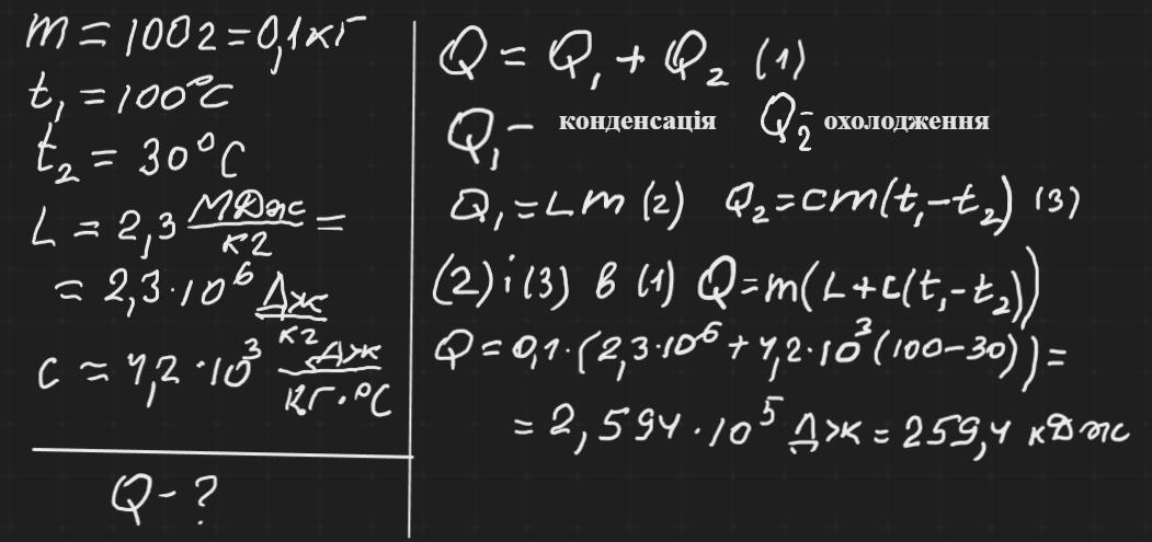 Скільки теплоти виділиться при конденсації 100 г води,взятої при температурі кипіння та подальшому охолодженню цієї води до 30 градусів