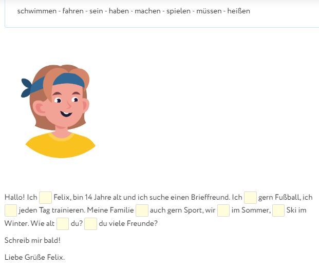 Hallo! Ich heiße Felix, bin 14 Jahre alt und ich suche einen Brieffreund. Ich spiele gern Fußball, ich spiele jeden Tag trainieren. Meine Familie machen auch Sport, wir schwimmen in Sommer, fahren Ski im Winter. Wie alt bist du? Hast du viele Freunde?