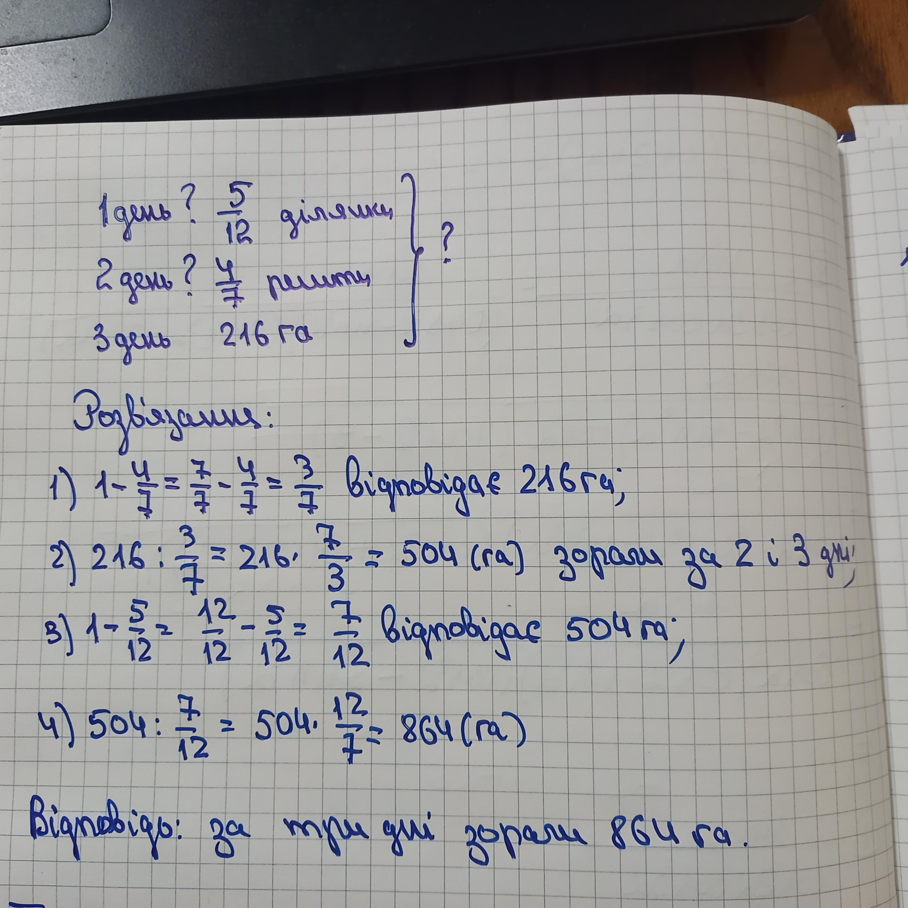 Бригада за 1 день зорала 5/12 ціеїї делягки за другий день 4/7 площі що залишилось а за 3 день решту 216 га Знайти площу всіеїї ділянки ??
