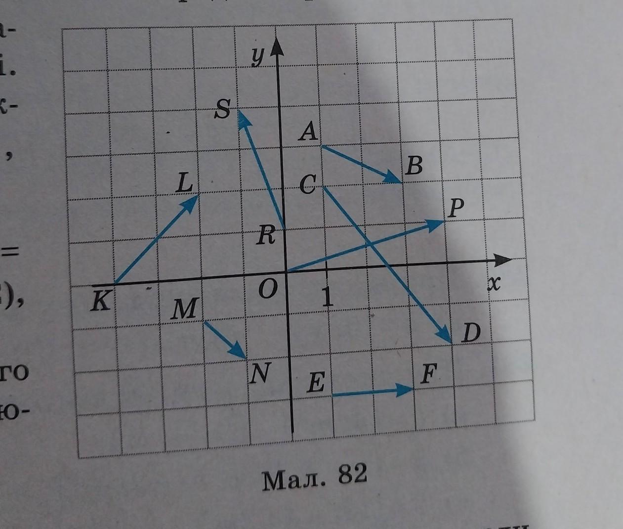 АВ {2;-1} 2) СD {3;-4} 3) EF {2;0} 4) OP {4;1} 5) MN {1;-1} 6) KL {2;2} 7) SR {-1;3}