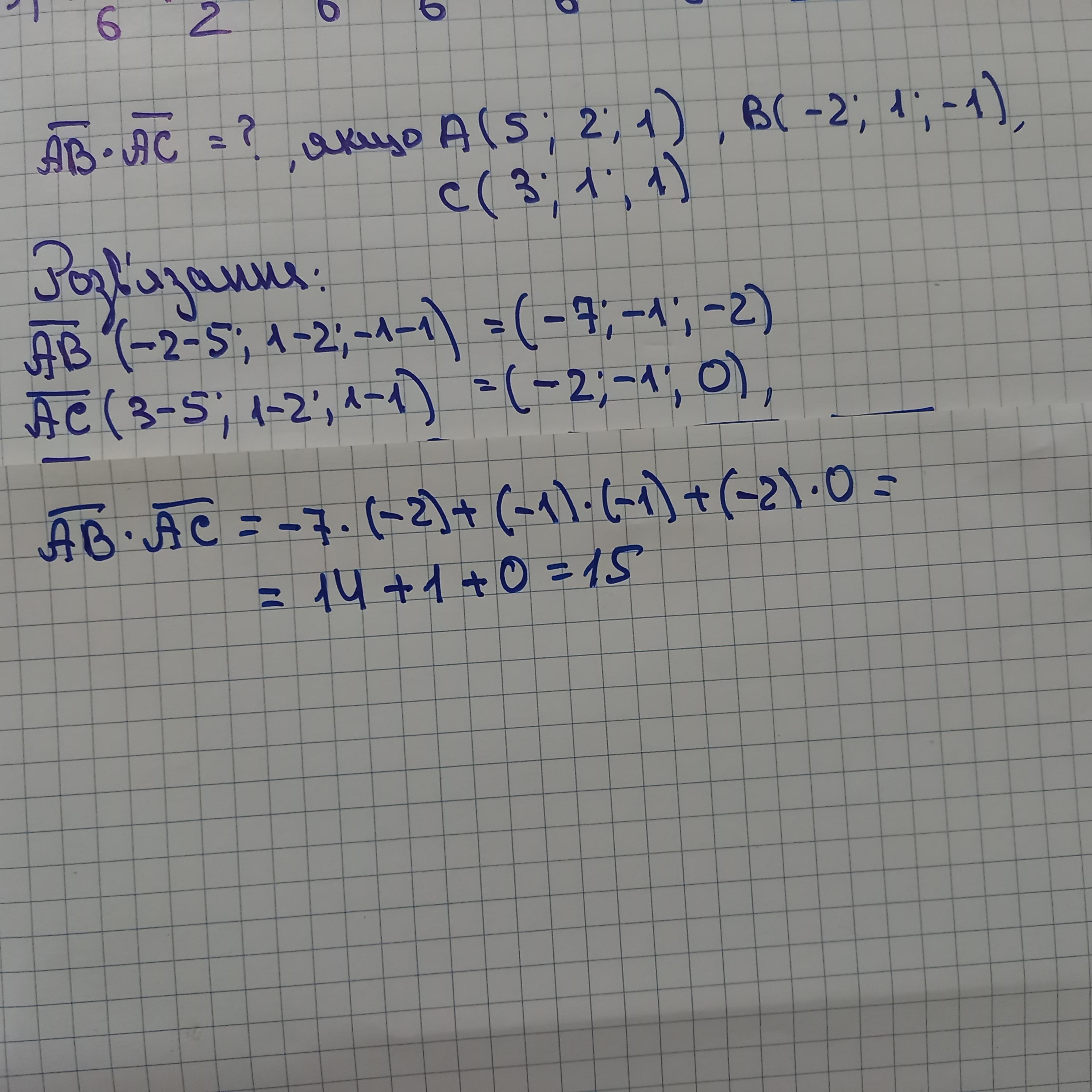 обчислити скалярний добуток векторів AB і AC якщо задані координати точок А(5;2;1) B(-2;1;-1) C(3;1;1)