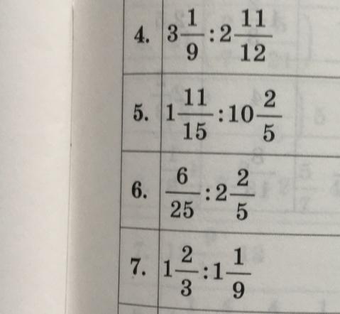 7. 1 2/3 : 1 1/9 = 5/3 × 9/10 = 1 1/2