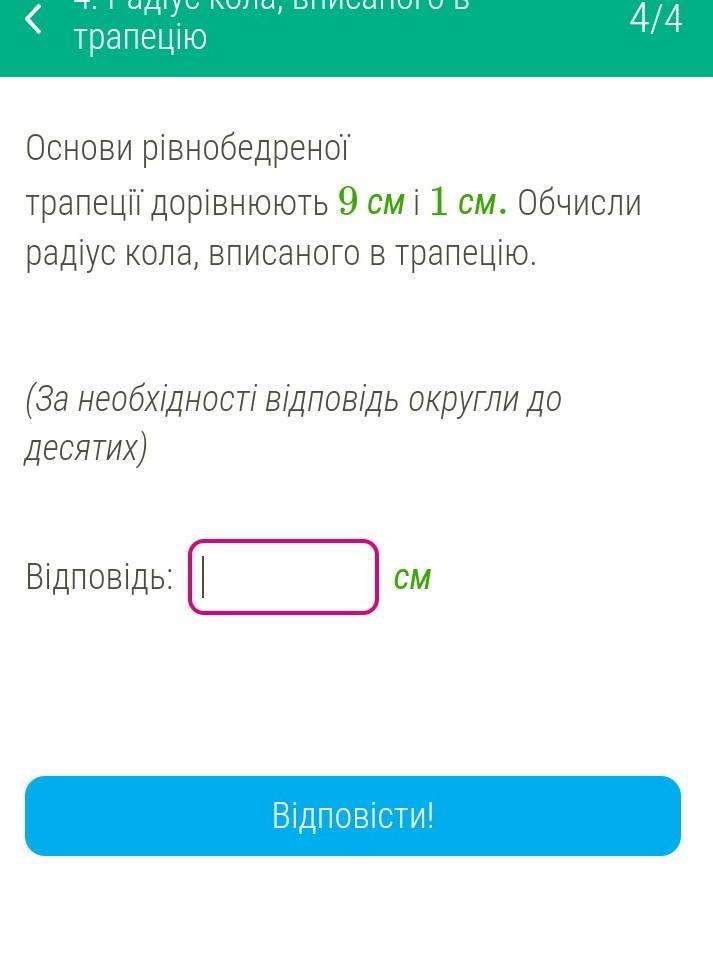 Срочно ..Основи рiвнобедреноï трапеції дорівнюють 9 см і 1 см. Обчисли радіус кола, вписаного в трапецію. на фотке написано какой нужен ответ