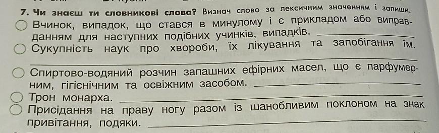 7. Чи знаеш ти словникові слова? Визнач слово за лексичним значенням і запиши. Вчинок, випадок, що стався в минулому і є прикладом або виправ данням для наступних подібних учинків, випадків. Сукупність наук про хвороби, їх лікування та запобігання їм. Спиртово-водяний розчин запашних ефірних масел, що є парфумер- ним, гігієнічним та освiжним засобом. Трон монарха. Присідання на праву ногу разом із шанобливим поклоном на знак привітання, подяки.