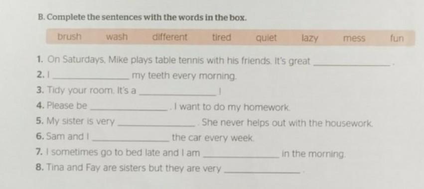 1. fun 2. brush 3. different 4. quiet 5. Lazy 6. wash 7. tired 8. mess