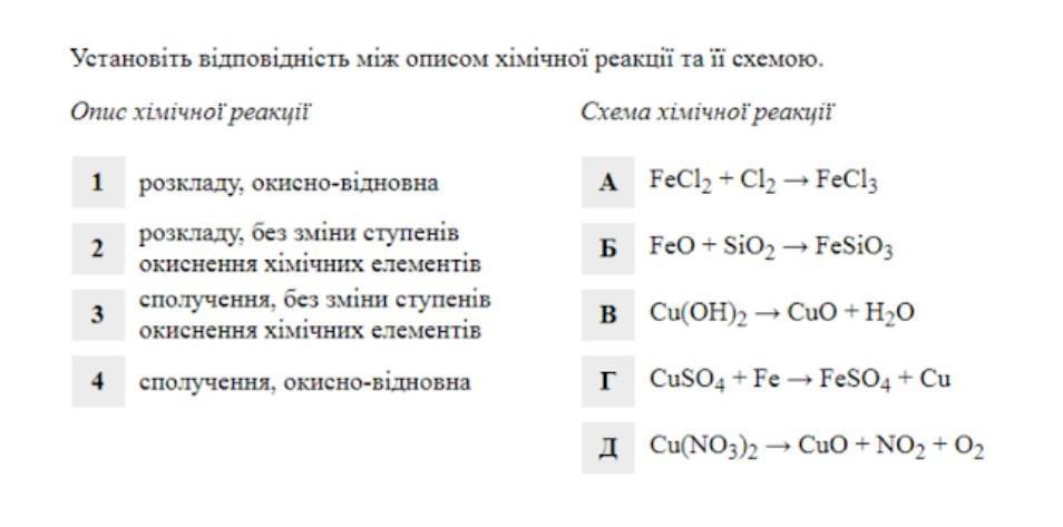 Установіть вiдповiднiсть мiж описом хімічної реакції та її схемою.