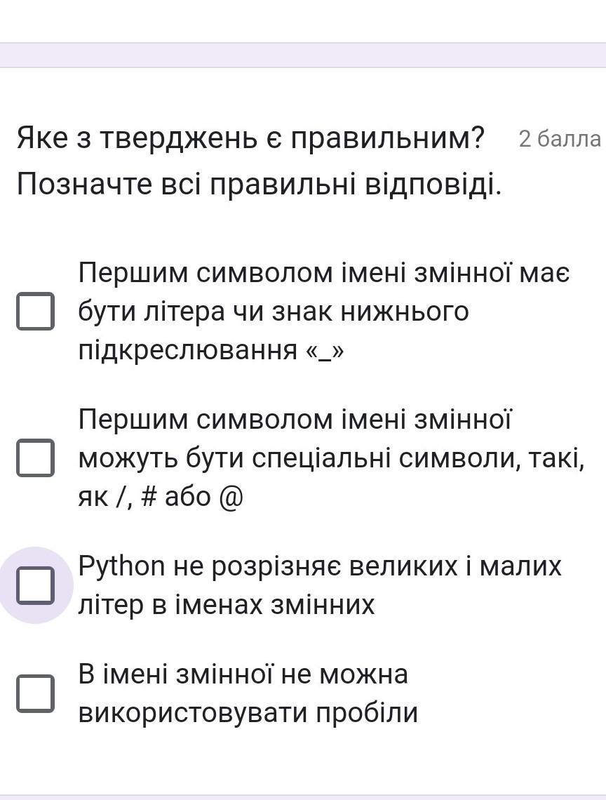 Яке з тверджень є правильним? 2 балла Позначте всі правильні відповіді. Першим символом імені змінної має бути літера чи знак нижнього підкреслювання > Першим символом імені змінної можуть бути спеціальні символи, такі, як /, # або @ Python не розрізняє великих і малих літер в іменах змінних В імені змінної не можна використовувати пробіли
