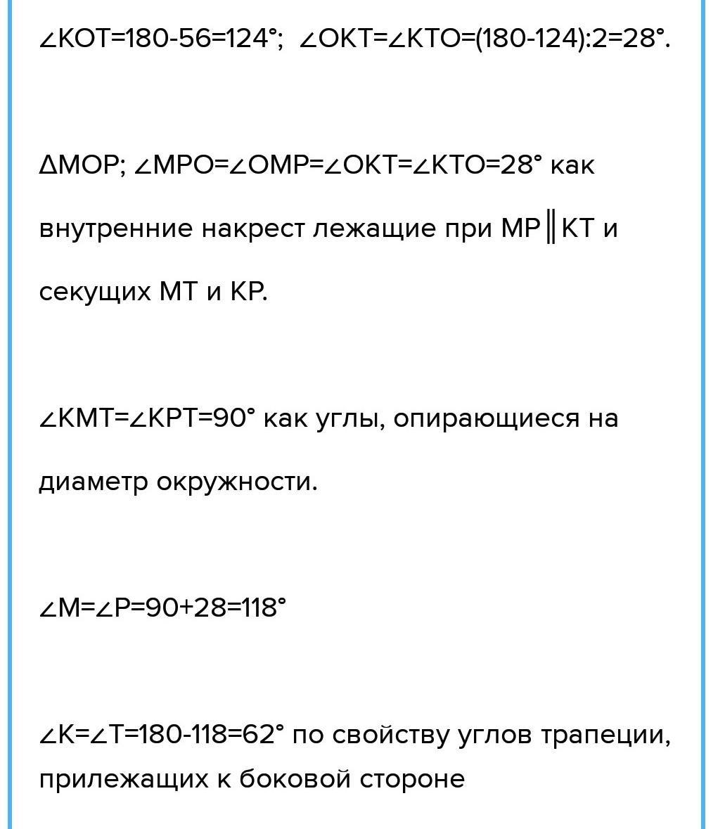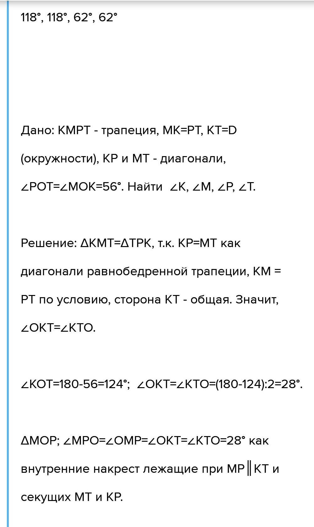 Рівнобічну трапецію вписано в коло, центр якого належить одній з основ. Кут між діагоналями трапеції, протилежний її бічній стороні, дорівнює 56°. Знайдіть кути трапеції