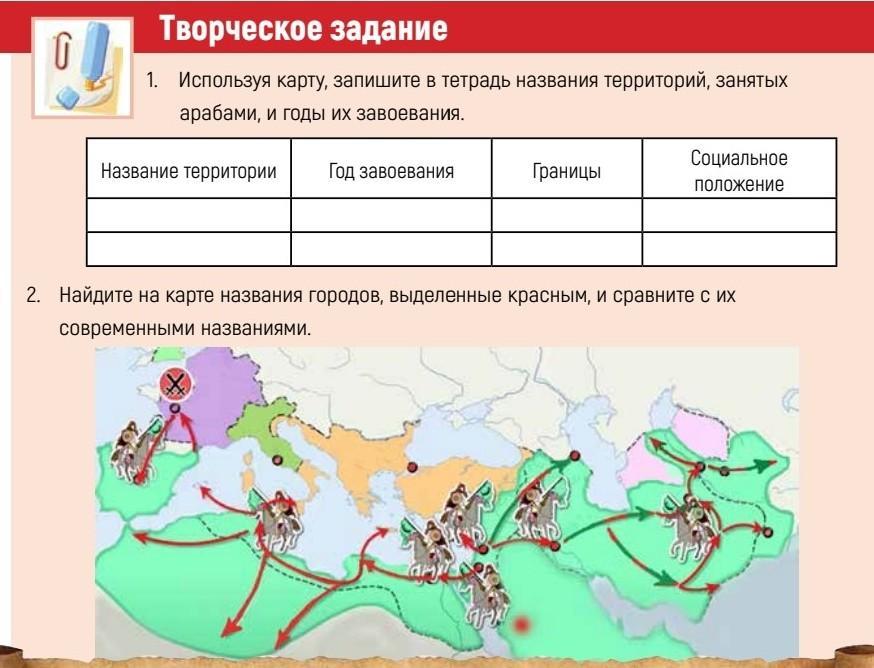 Используя карту,запишите в тетрадь названия территорий,занятых арабами,и годы их завоевания.
