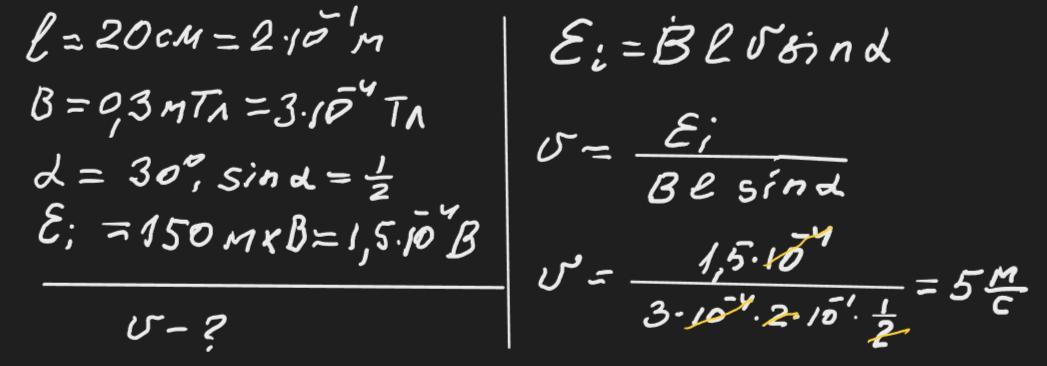Провідник завдовжки 20 см рухається в однорідному магнітному полі індукцією 0.3 мТл так, що кут між напрямком швидкості руху провідника та напрямком магнітної індукції поля становить 30°. Визначте швидкість руху провідника, якщо в ньому виникає ЕРС індукції 150 мкВ