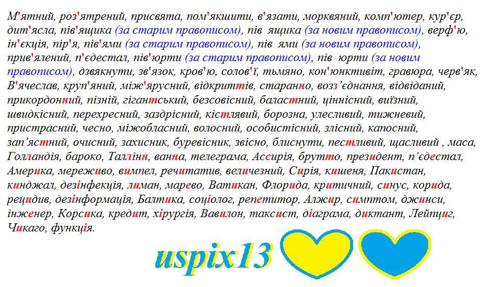 м..ятний, роз..ятрений, присв..ята, пом..якшити,в..язати, моркв..яний, комп..ютер, кур..єр, дит..ясла, пів..ящика, верф..ю, ін..єкці ,пір..я, пів..ями, прив..ялений, п..єдестал, пів..юрти, дзв..якнути, зв..язок, кров..ю, солов..ї, тьм..яно, кон..юнктивіт, грав..юра, черв..як, В..ячеслав, круп..яний, між..ярусний, відкрит..ів, старан..о, воз..’єднання, відвідан..ий, прикордон..ий, піз..ній, гіган..ський, безсовіс..ний, балас..ний, цінніс..ний, виїз..ний, швидкіс..ний, перехрес..ний, заздріс..ний, кіс..лявий, бороз..на, улес..ливий, тиж..невий, пристрас..ний, чес..но, міжоблас..ний, волос..ний, особистіс..ний, зліс..ний, капос..ний, зап’яс..ний, очис..ний, захис..ник, буревіс..ник, звіс..но, блис..нути, пес..ливий, щас..ливий , мас..а, Гол..андія, барок..о, Тал..ін.., ван..а, телеграм..а, Ас..ирія, брут..о, през..дент, п’єд..стал, Амер..ка, мереж..во, в…мпел, реч..татив, вел..чезний, С..рія, к..шеня, Пак..стан, к…нджал, дез..нфекція, л..ман, мар..во, Ват..кан, Флор..да, кр..тичний, с..нус, кор..да, рец..див, дез..нформація, Балт..ка, соц..олог, реп..титор, Алж..р, с..мптом, дж..нси, інж..нер, Корс..ка, кред..т, х..рургія, Вав..лон, такс..ст, д..аграма, д..ктант, Лейпц..г, Ч..каго, функц..я.