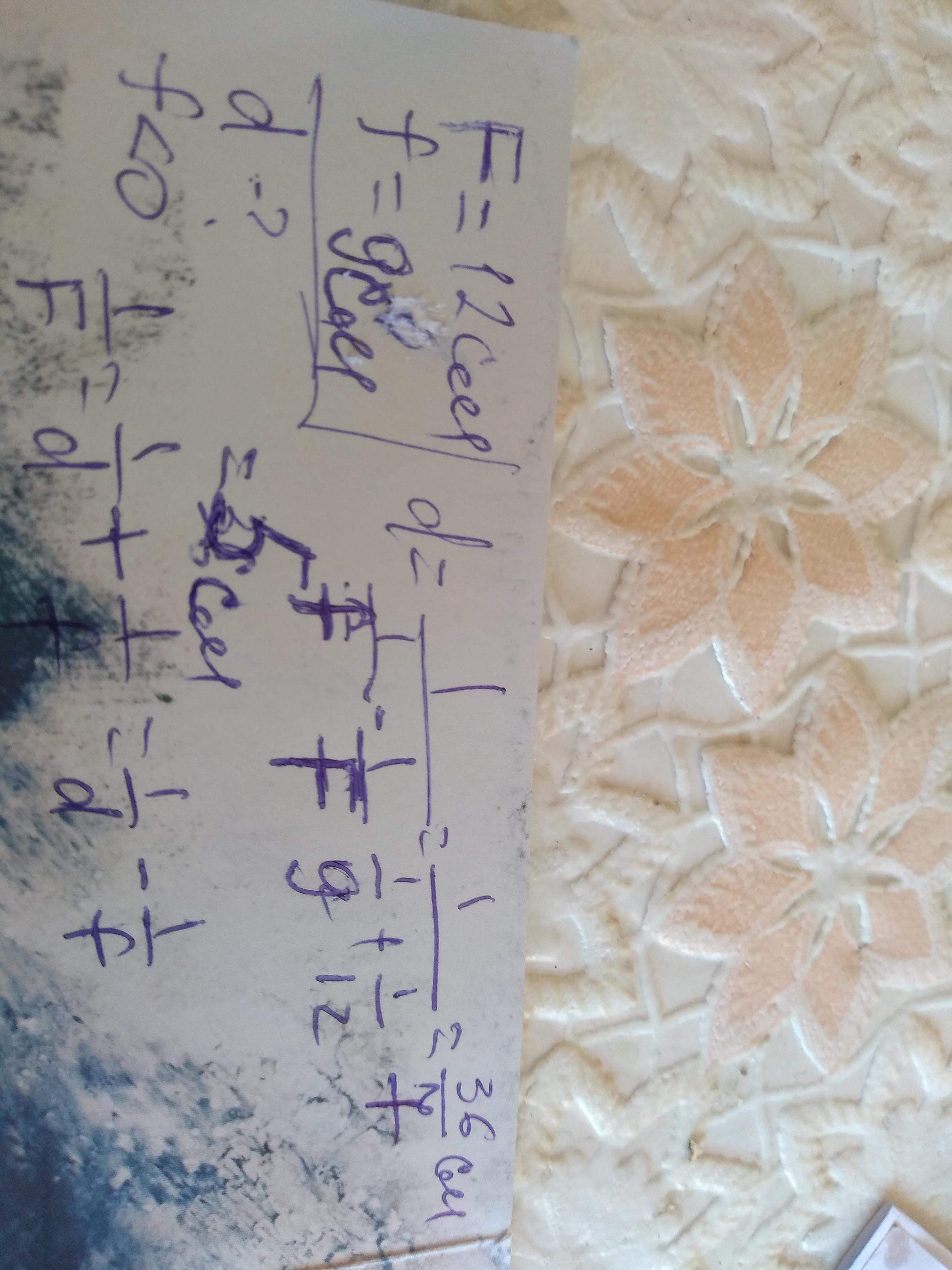 Фокусна відстань розсіювальноï лінзи дорівнює 12 см. Зображення предмета знаходиться на відстані 9 см від лінзи. Визначте відстань від лінзи до предмета. Відповідь дати в см з точністю до цілих. Жодну розмірність не записувати, тільки число. Формат запису відповіді: ціле число без розмірності.
