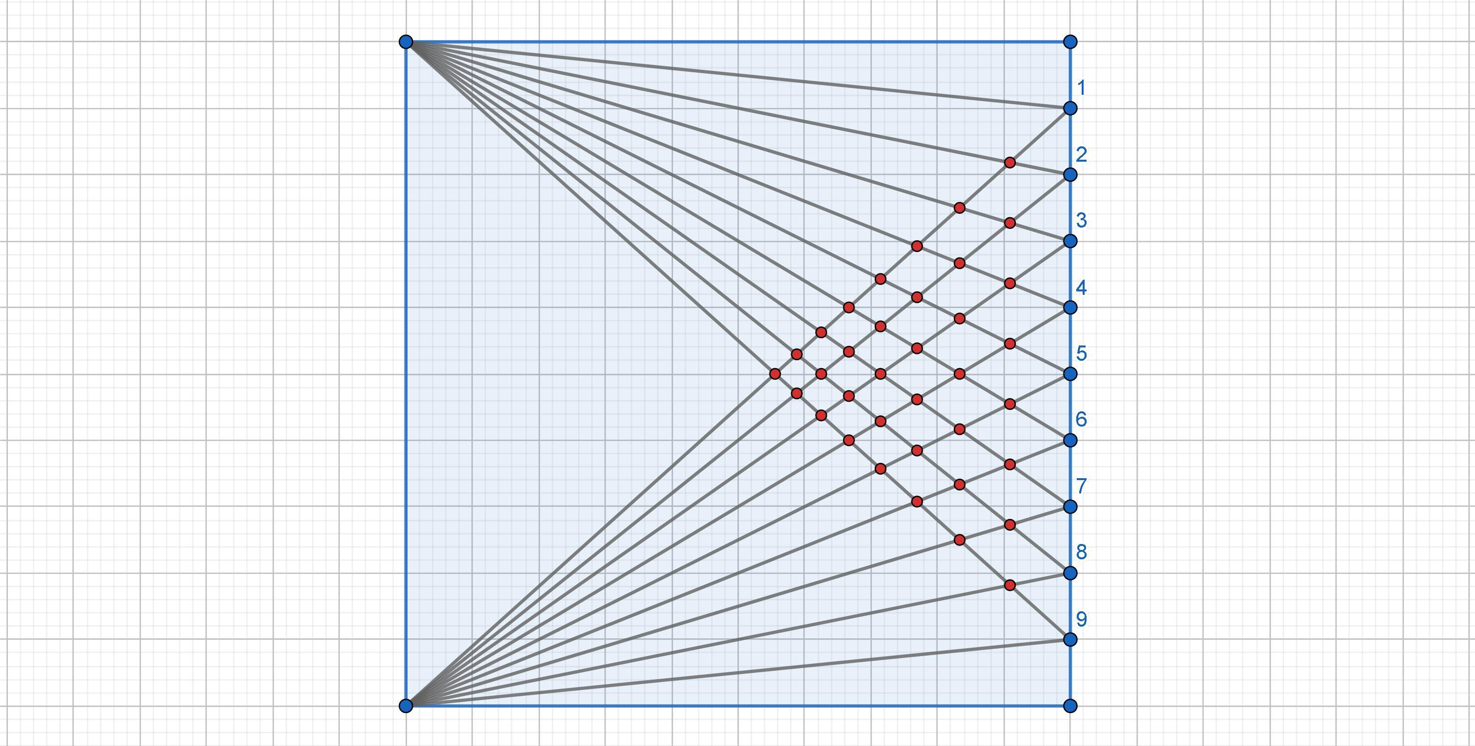 Создадим квадрат и правую сторону разделим на 10 частей с 9 точками. Далее соединяем отрезками каждую из 9 точек деления с двумя вершинами квадрата, не являющимися концами этой правой стороны.
