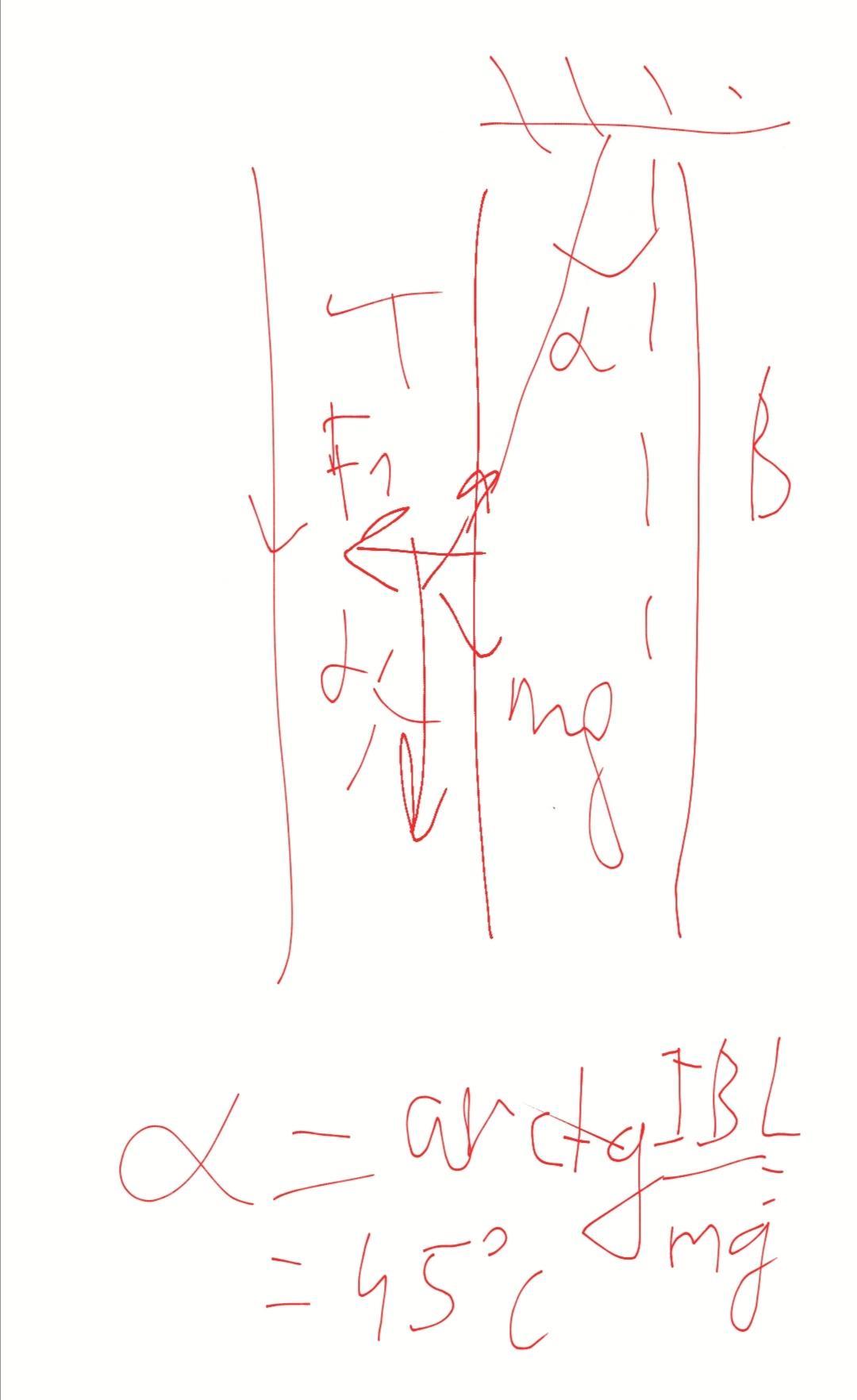 В однородном магнитном поле с индукцией B = 0,5 Тл (линии индукции направлены вертикально вверх) подвешен на двух вертикальных нитях горизонтальный проводник массой m = 30 г и длиной 1 = 49 см. По проводнику пропускают ток силой I = 1,2 A. На какой угол а от вертикали отклонятся нити, поддерживающие проводник?