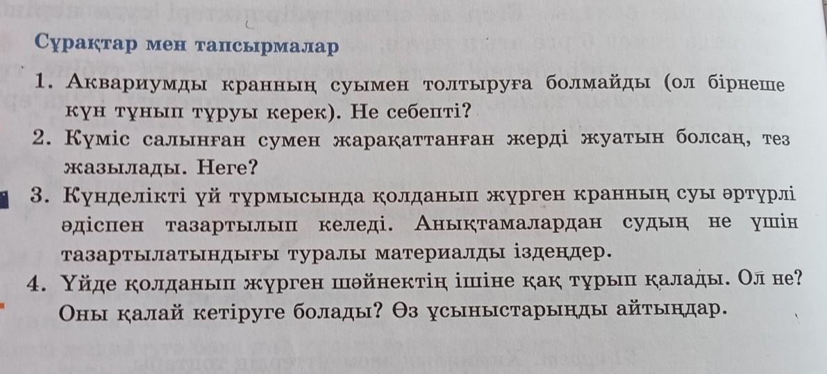 Сурактар мен тапсырмалар 1. Аквариумды кранның суымен толтыруға болмайды (ол бірнеше 2. Күміс салынған сумен жарақаттанған жерді жуатын болсаң, тез күн тұнып тұруы керек). Не себепті? жазылады. Неге? судың не үшін 13. Күнделікті үй тұрмысында қолданып жүрген кранның суы әртүрлі әдіспен тазартылып келеді. Анықтамалардан тазартылатындығы туралы материалды іздеңдер. 4. Үйде қолданып жүрген шәйнектің ішіне қақ тұрып қалады. Ол не? Оны калай кетіруге болады? Өз ұсыныстарынды айтындар. ПОМОГИТЕ ПЖШКА