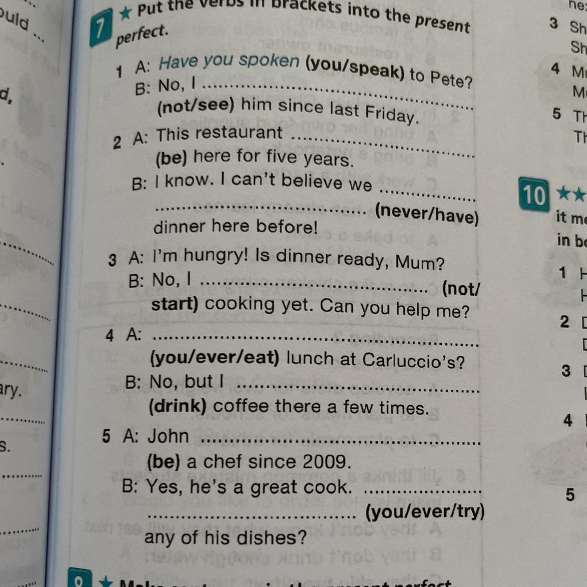 1 haven't seen 2 has been- have had 3 haven't started 4 have you ever eaten -have drunk 5 has been-have you ever tried