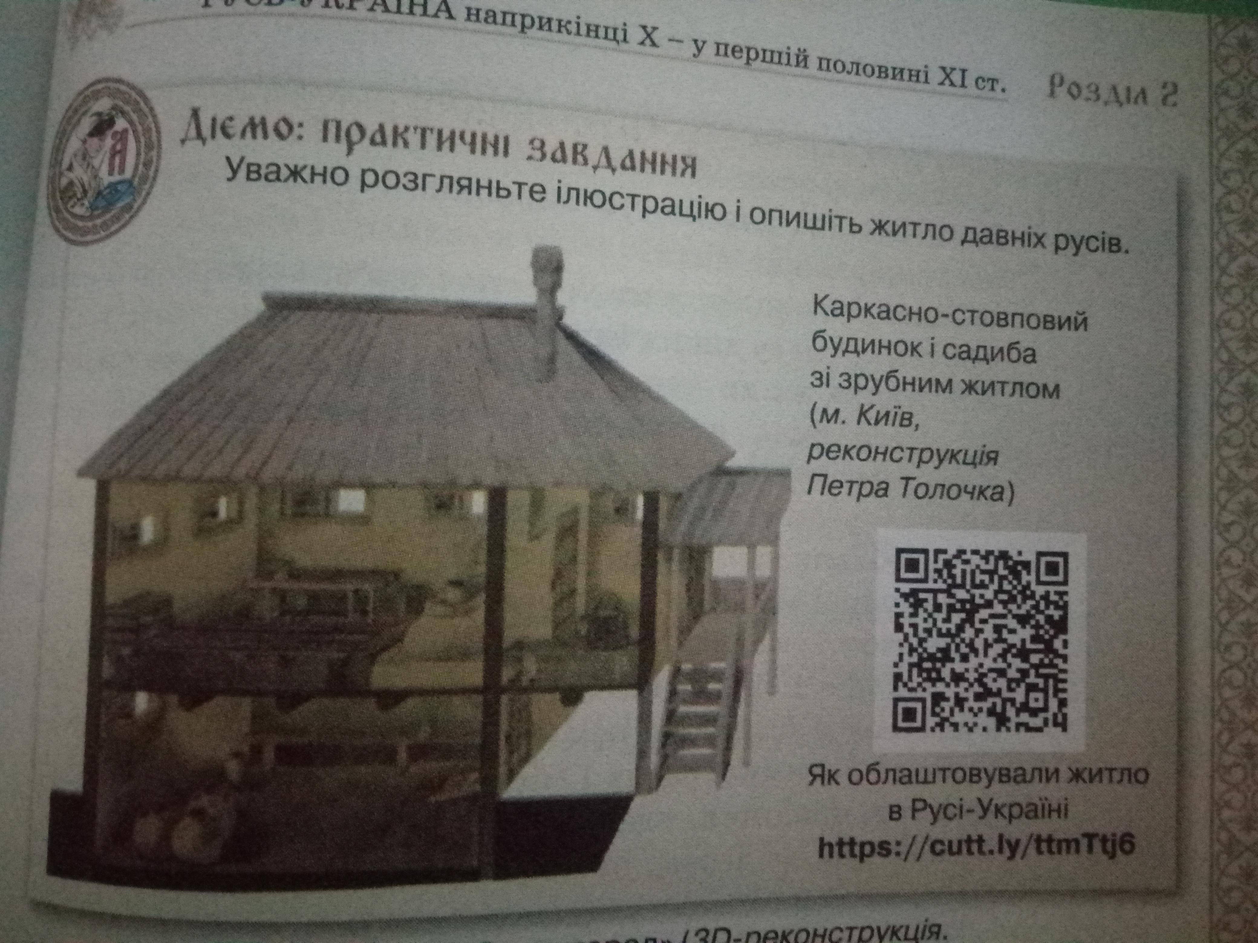 Діємо: практичні завдання. Уважно розгляньте ілюстрацію і опишіть житло давніх русів.