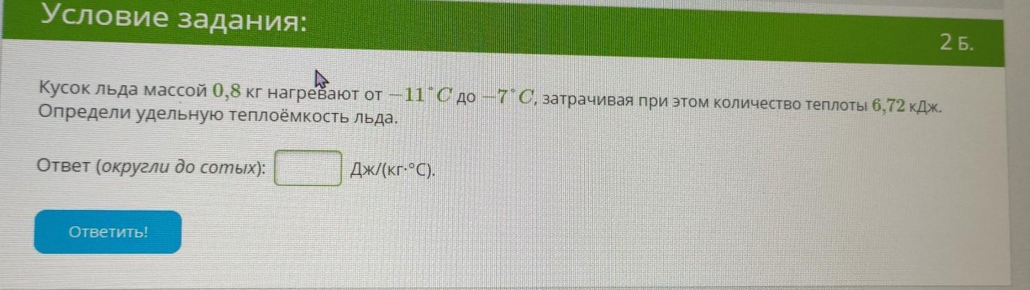 с=Q/(m(t2-t1))=6720/(0,8*(-7+11)=2100Дж/кг°С