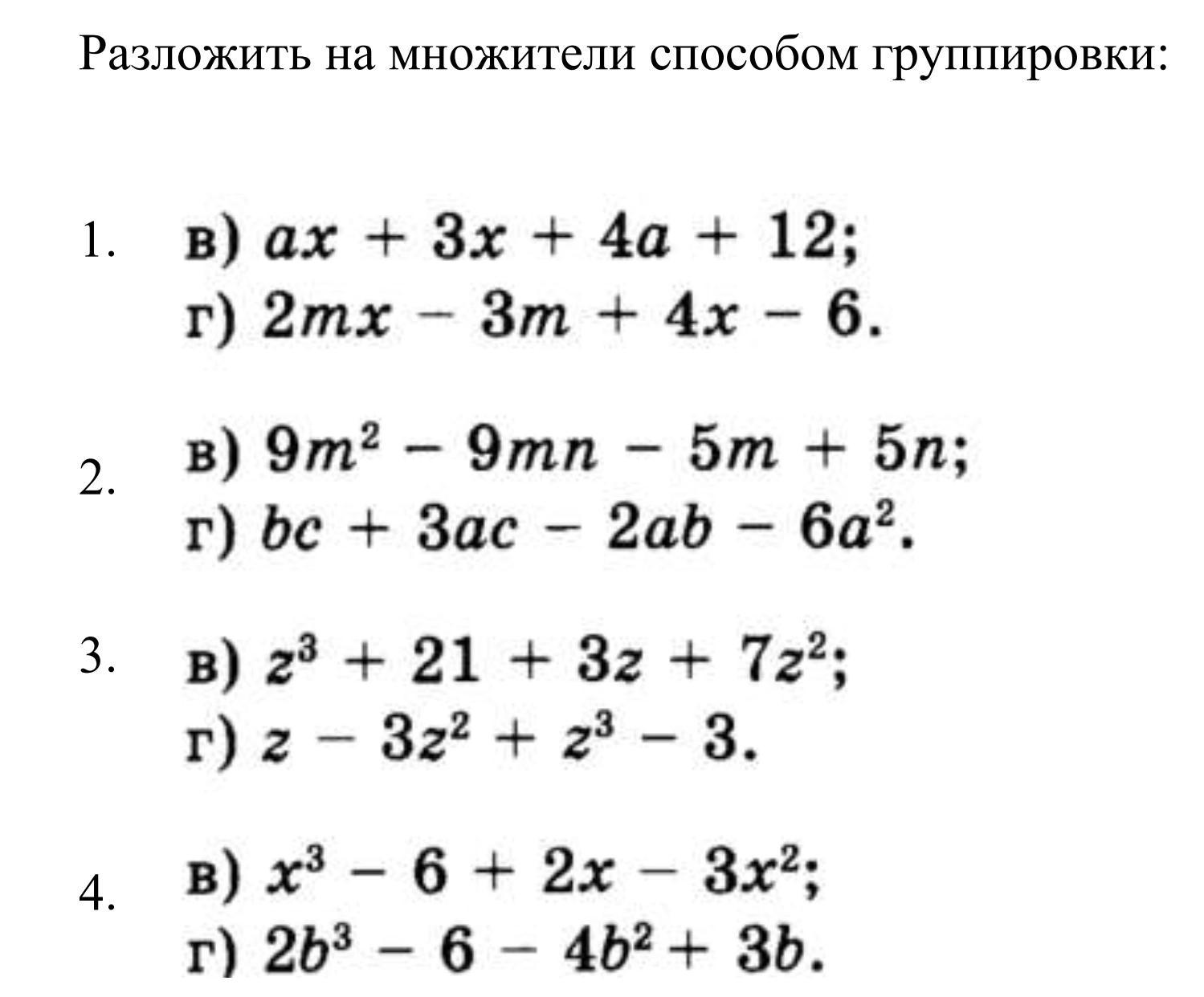 г) bc+3ac-2ab-6a²=(3ac-6a²)+(bc-2ab)=