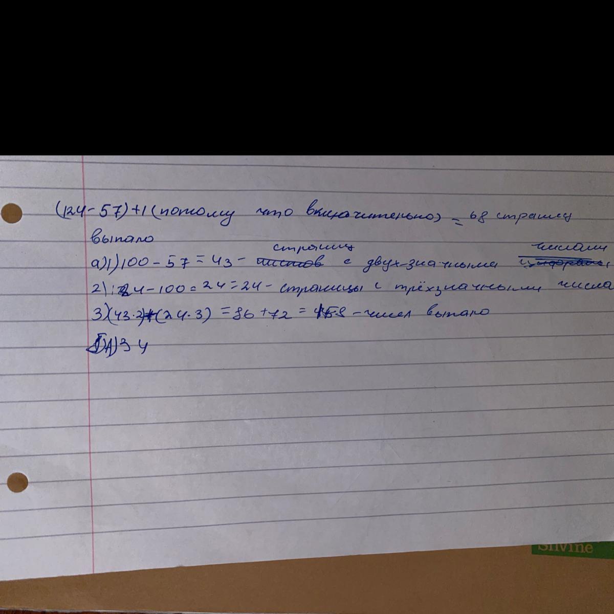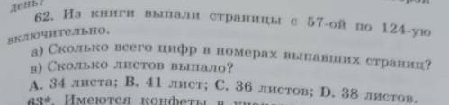 62. Из книги выпали страницы с 57-ой по 124-ую включительно. а) Сколько всего цифр в номерах выпавших страниц? в) Сколько листов выпало? А. 34 листа; В. 41 лист; С. 36 листов; D. 38 листов.