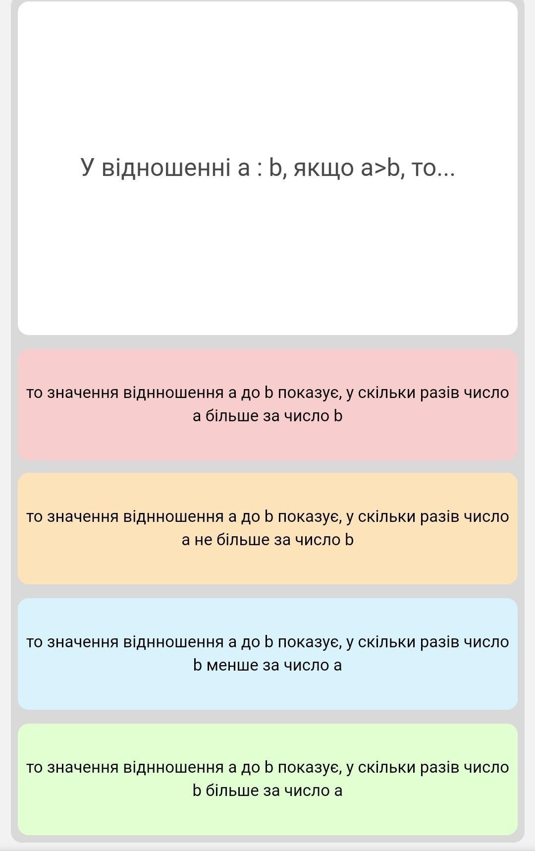 То значення відношення а до б показує, у скільки разів число а більше за число б