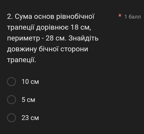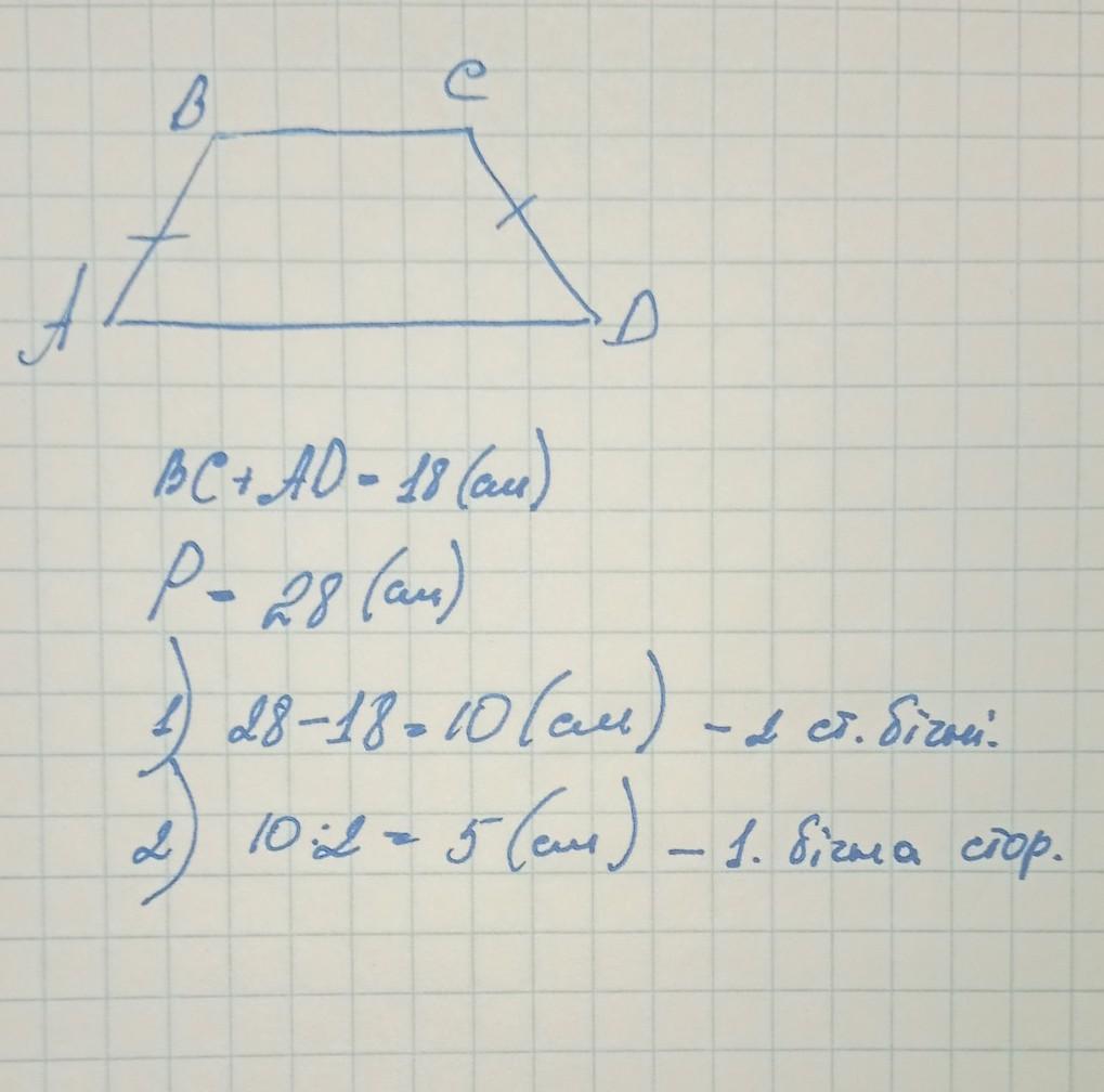 тому що в рівнобічній трапеції бічні сторони рівні, отже 28-18=10-їх сума