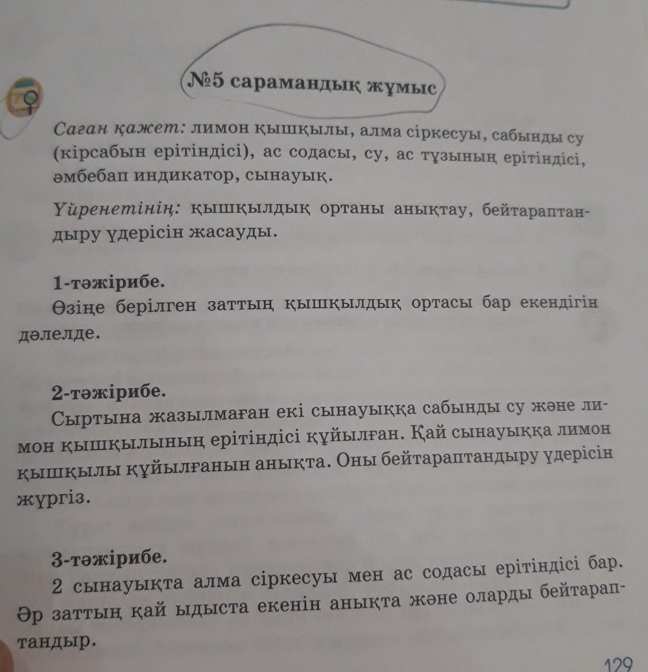 саған қажет:лимон қышқылы,алма сіркесуы,сабынды су (кір сабын ерітіндісі),ас содасы,су,ас тұзының ерітіндісі,әмбебап индикатор,сынауық.