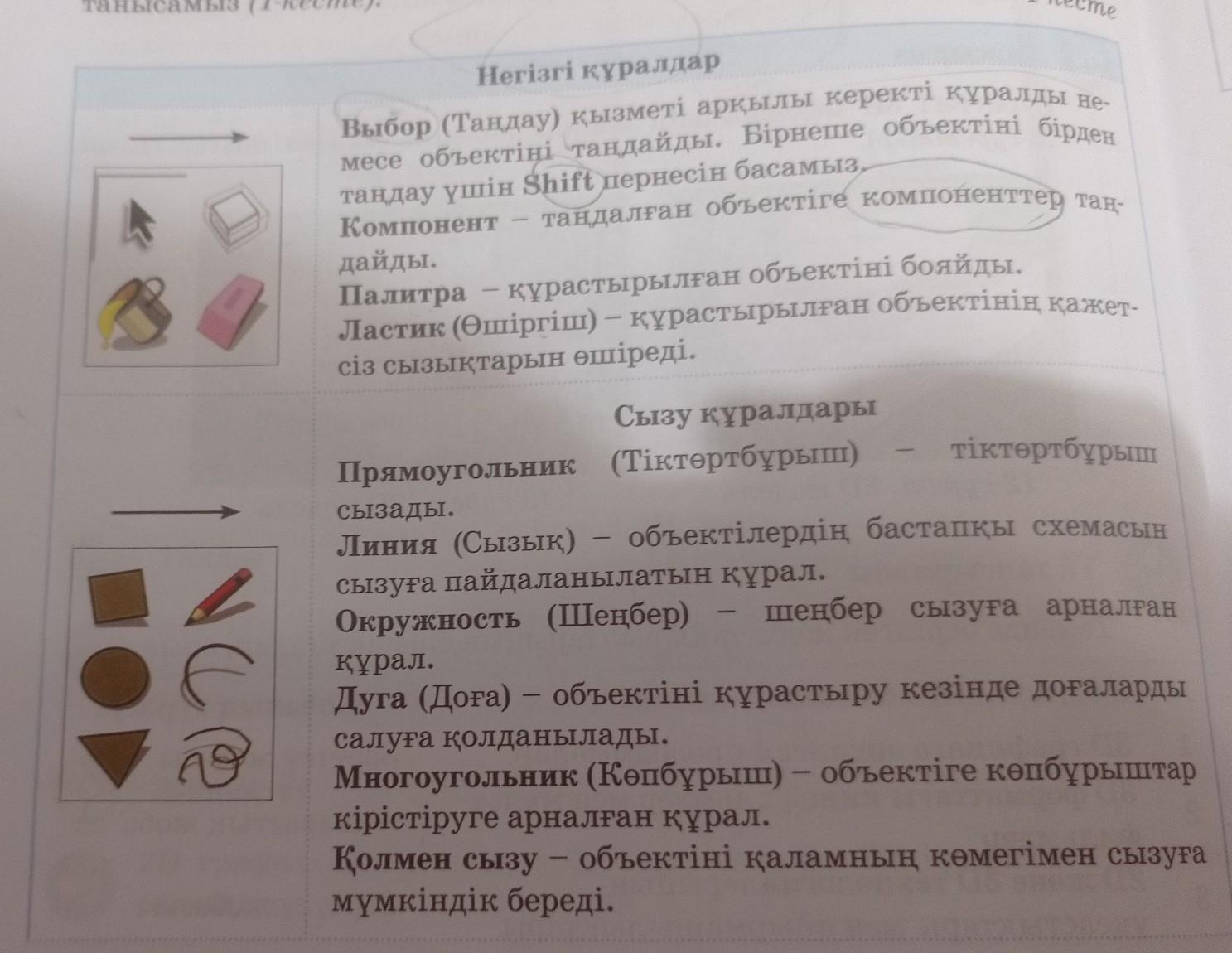 ол жақта точно ответь беру қиын өйткені sketchUp программаның көп деген құралдары бар.Және де олар екі түрге бөлінеді1):негізгі құралдар,2)Сызу құралдар.Олар:1)Выбор,2)Компонент,3)Палитра,4)Ластик.Сызу құралдары:1)Прямоугольник,2)Линия,3)Окружность,4)Дуга,5)Многоугольник,6)Қолмен сызу.Негізгі құралдар 4-еу олар ,,выбор``деген құралдан бастап сол құрал арқылы барлығы біріккен менің ойымша жауабы ,,выбор``