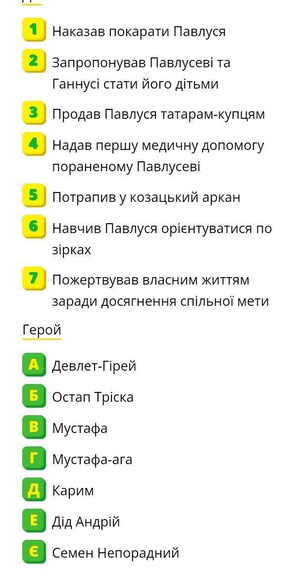 Відповідь: 1В, 2А, 3Д, 4Є, 5Г, 6Е, 7Б